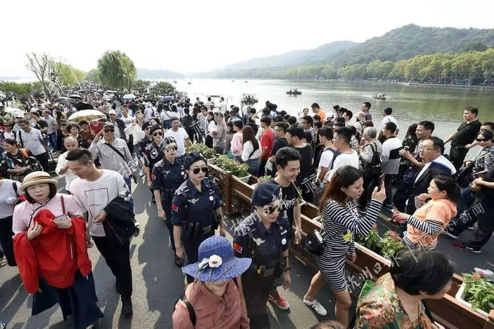 国庆假日里,西湖景区游客爆棚,景区工作人员协同公安、城管、公交、环卫等部门以及来自社会各界的志愿者们,共同构筑起一道保平安、促通畅、便服务的假日旅游保障线,确保游客安全、愉悦地游览西湖美景,感受杭州的文明素质。
