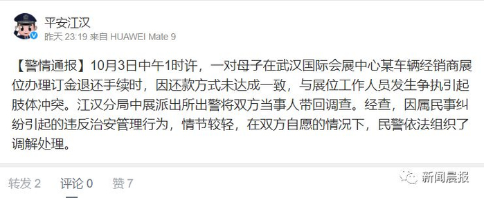 6日深夜,武汉警方微博@平安江汉 发布信息,称10月3日中午1时许,一对母子在武汉国际会展中心某车辆经销商展位办理订金退还手续时,因还款方式未达成一致,与展位工作人员发生争执引起肢体冲突。但未明确表示就是视频展示的事件。