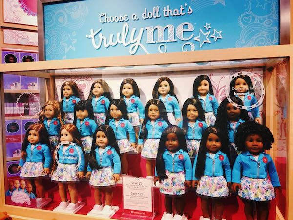 相比于席卷全球的芭比娃娃,“美国女孩”这个玩偶品牌在中国还鲜为人知。如果第一次走“美国女孩”漂亮的店面,可能会感到十分惊奇——几乎每个小女孩都带着一个和自己几乎一样的娃娃!这个小姑娘有一头柔顺的金发和湛蓝的大眼睛,她怀中的娃娃也是金发碧眼;那个小姑娘是栗色的自来卷和橄榄色的眼珠,而她背在背后的娃娃也和她长得一样。最重要的是,不仅是头发和眼睛的颜色,“她们”的肤色、五官甚至衣着都是一模一样的!在“美国女孩”里,映入眼帘的是一群相貌、衣着、生活场景都千姿百态的娃娃,宛如一个小型社会。有金发碧眼的洋娃娃,也有皮肤黝黑的非裔娃娃,有肤色褐黄、梳着长辫子的美洲原住民娃娃,当然也有黑头发黑眼睛、穿着旗袍的中国娃娃。不同的特征都被严谨地分类编号,便于选择,除了可以指定肤色、发色、眼睛颜色,甚至还可以指定五官的样子和雀斑的位置。这里有生活在城市的娃娃,也有生活在乡村或是农场的娃娃,有打扮时髦的,也有穿传统服装的……毫不夸张地说,无论是何种相貌和文化背景的小女孩,都可以在这里找到迷你的自己。