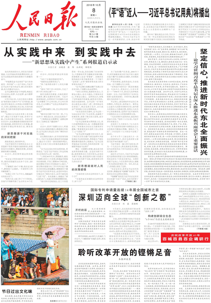 9月中旬以来,人民日报在头版推出“新思想从实践中产生”系列报道,通过记者实地走访,从贫困山村到繁华城市,从黄土高原到山水江南,从国内到国外,努力探寻新思想形成和发展的实践轨迹。