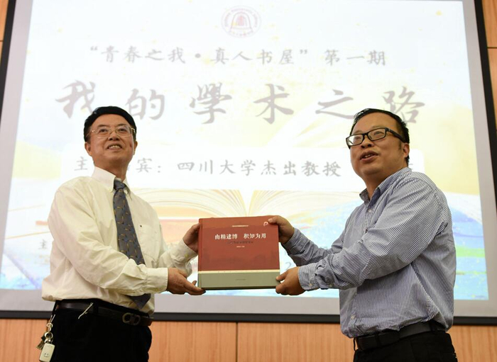 在主题朗诵《青春》中,真人书屋首场活动拉开序幕。图书馆馆长党跃武介绍:“青春之我•真人书屋”将遴选和推荐具有巨大影响力的人物和学者作为真人图书,引领师生闻其言,瞻其行,读其书,悟其道,提高文化素养和文化品位。今后将陆续推出“川大记忆”、“创新创业”和“感动川大”三个系列。
