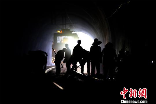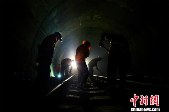 铁路工人在隧道内进行人工捣固作业。 汪翰 摄
