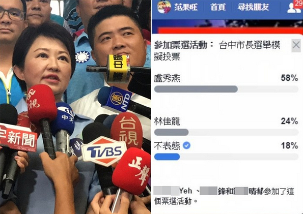 国民党籍卢秀燕模拟投票大胜民进党林佳龙(图源:东森新闻网)