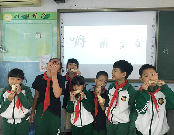 上课了,周玲玲拎着一袋甘蔗进教室,告诉孩子们这是今天的教具。随后,学生们七个一组走上讲台演示“嚼”的动作,周玲玲在一旁点评:不少同学是“啃”,牙齿和嘴巴用力;这个同学才是“嚼”,咬下一块甘蔗,放进嘴里,用牙齿上下咀嚼。随后,她讲解了“齿”、“嚼”的起源和演变,以及“嚼”的不同读音和相应词组。