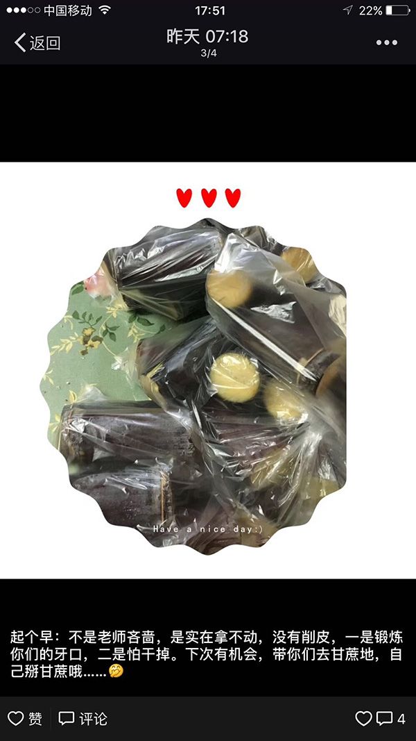 7日晚,她从老家甘蔗地里挑了10根运到学校附近的住处。为保证新鲜,8日一早才将甘蔗洗净,切下多汁的中段,给班里35个孩子每人带了一小段。