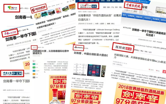 与此同时,国内200多家媒体也纷纷报道,对剑南春此次勇夺第一给予了高度评价,国内的各大网站、行业媒体以及知名大号纷纷转发报道,引发全民热议,一度形成刷屏之势!