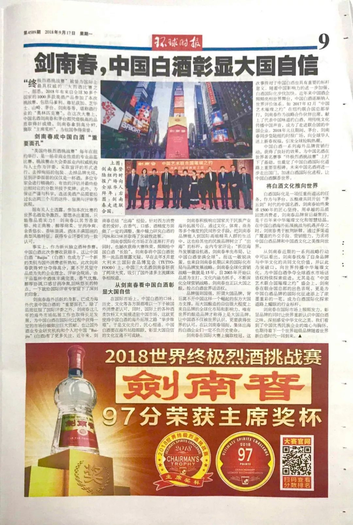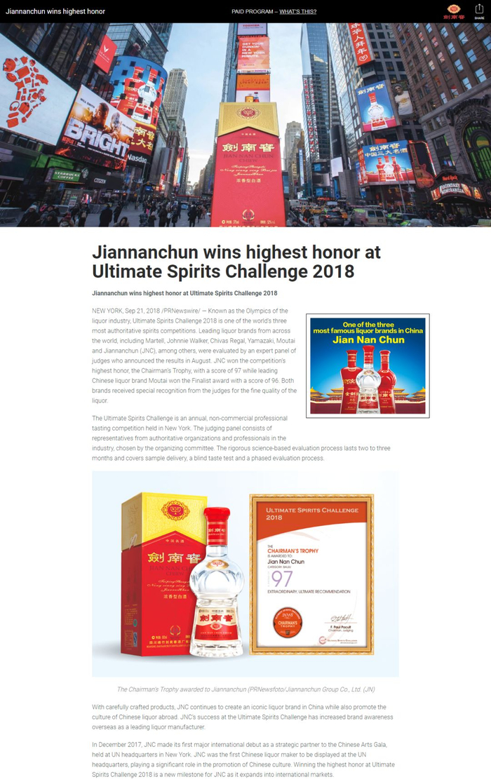 创刊于1889年的《华尔街日报》是全美付费发行量最大的财经报纸之一,作为美国的权威媒体,华尔街日报大篇幅报道了剑南春斩获“终极烈酒挑战赛”主席奖杯的新闻,报道从此次比赛的竞争激烈程度、评审权威程度等方面客观分析了赛事的含金量,并为剑南春取得如此高的成绩赞誉有加!