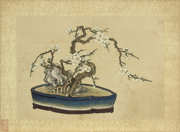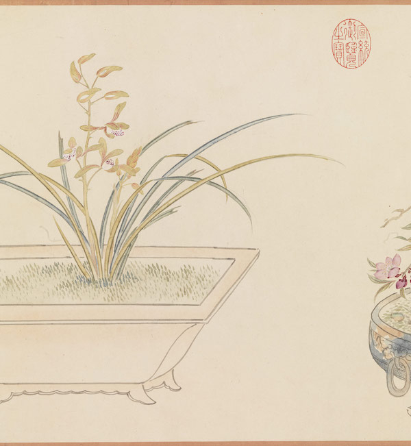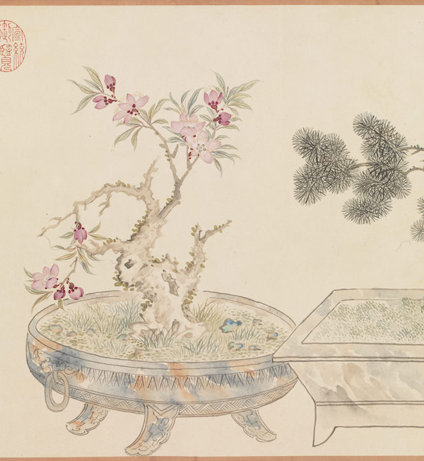 长久以来,植物一直是艺术家创作灵感的来源,其枝干、花叶的繁复构造与多样的色彩面貌,展现出大自然奥妙与季节的变化。花木可在土地自然生长,亦可经由人工培育,再移入室内赏玩。而将植物转化为审美对象与艺术题材,其形式除折枝写生外,常见还有“瓶花”与“盆景”。“瓶花”顾名思义,即用容器插贮四季花卉,花枝剪裁讲求比例姿态;“盆景”乃将木本、草本植物经过修剪、攀扎移种于盆盎,两者皆著重表现人为的造化之美。