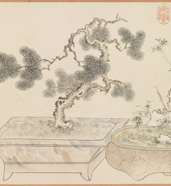 盆景是以植物、奇石为素材,经过人工剪扎栽培,种于盆盎呈现微缩的园艺之美。唐、五代宫廷流行于庭园种树、造景,促使花木种类与栽培技术日益发展。宋代宫廷、文人讲究生活情趣,喜莳花养石,以花台湖石造景,盆池植栽花木,罗列园林轩室中,专供观赏或装饰。