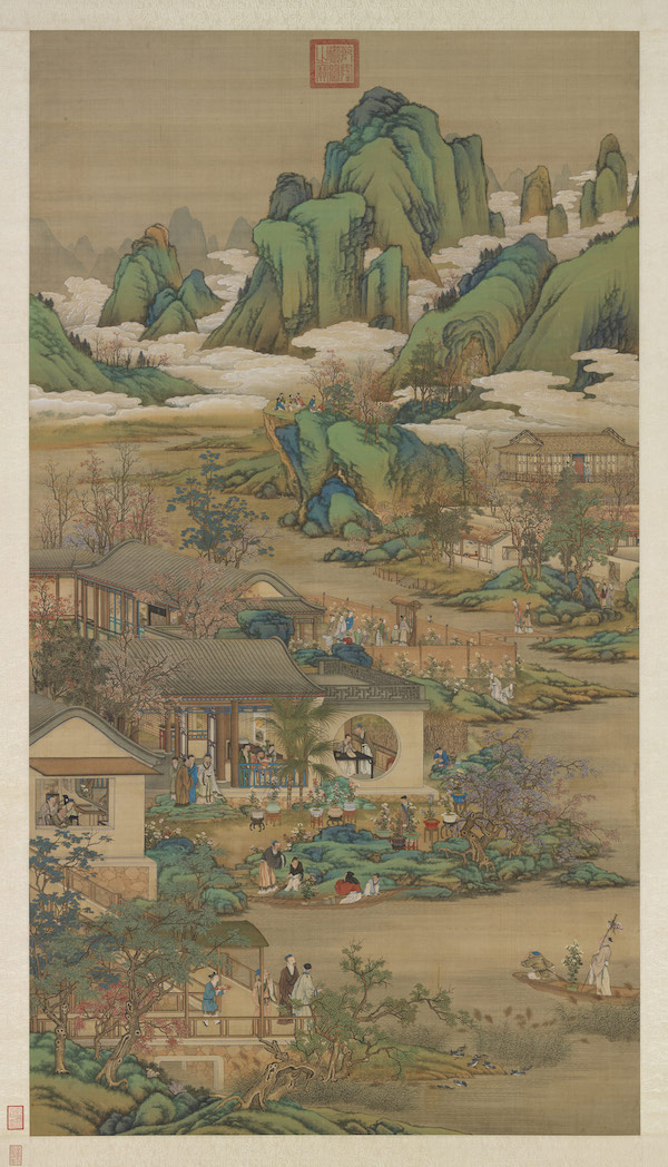 园林与建筑群掩映于青山绿水之间,展现皇家御园设计的规模,与花木植栽的丰富。登高眺远、赏菊饮酒,为农曆九月重阳节习俗。种菊有悠然野趣,秋天植物鲜明的季节变化,景色怡人。篱牆旁露地栽培的丛菊盛开,仕女孩童游赏其间;中景众人聚集赏菊,院中各色丛菊争研,搭配不同类型瓷盆、几座,美不胜收;前景小舟运送盆栽、酒罐,载送访客泊舟登岸。