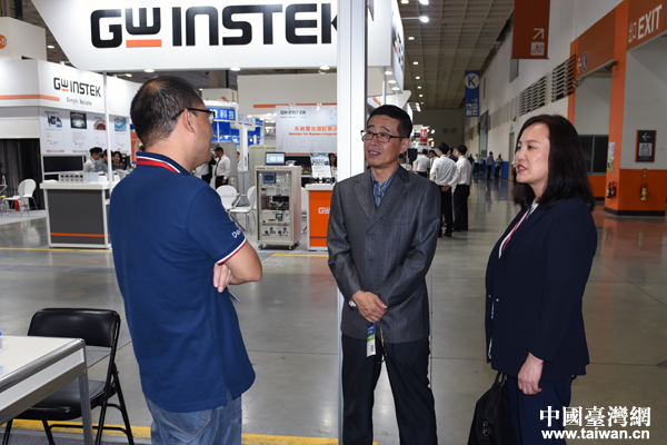 高伟副主任(中)和刘春副会长(右)与参加海峡两岸电子展大陆企业交谈。(机电商会台北办事处供图 中国台湾网发)