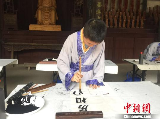 身着传统书法服饰,手握毛笔、姿势端庄,走近“中国重点文物保护单位”华堂王氏宗祠内,数十位王羲之后裔正专注地书写王氏家训。56岁的王德忠则是他们的书法老师之一。