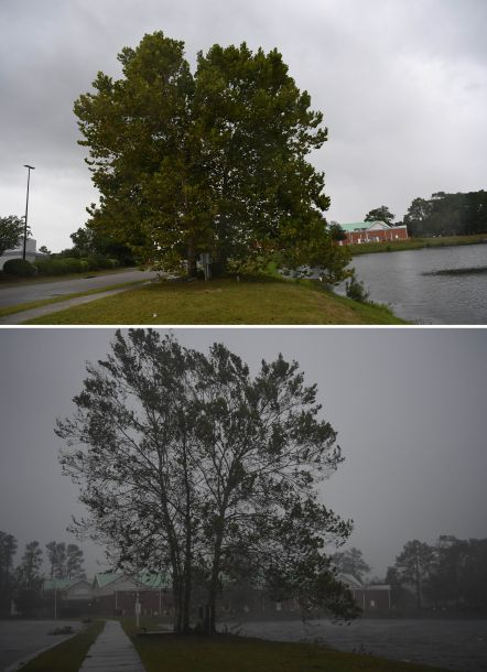 拼版照片:上图为9月13日在美国北卡罗来纳州威尔明顿市拍摄的小雨中的大树;下图为9月14日在美国北卡罗来纳州威尔明顿市拍摄的暴风雨中的大树。新华社记者刘杰摄