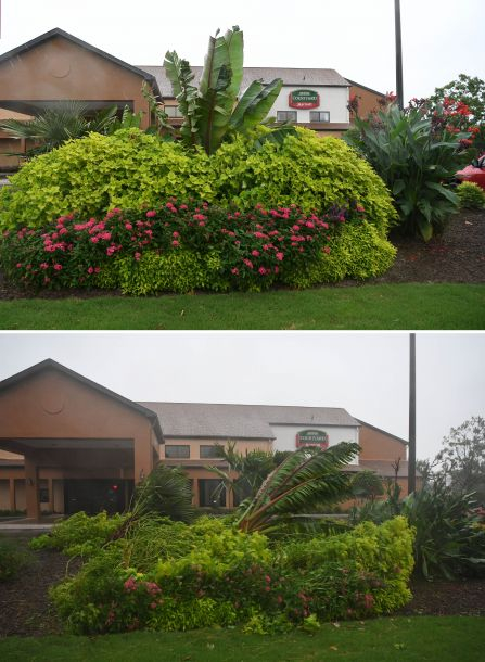 拼版照片:上图为9月13日在美国北卡罗来纳州威尔明顿市拍摄的小雨中的路边绿植;下图为9月14日在美国北卡罗来纳州威尔明顿市拍摄的暴风雨中的路边绿植。北卡罗来纳州威尔明顿市遭遇飓风“弗洛伦斯”带来的强烈暴风雨袭击,导致河水暴涨、街道积水,并出现停电。新华社记者刘杰摄