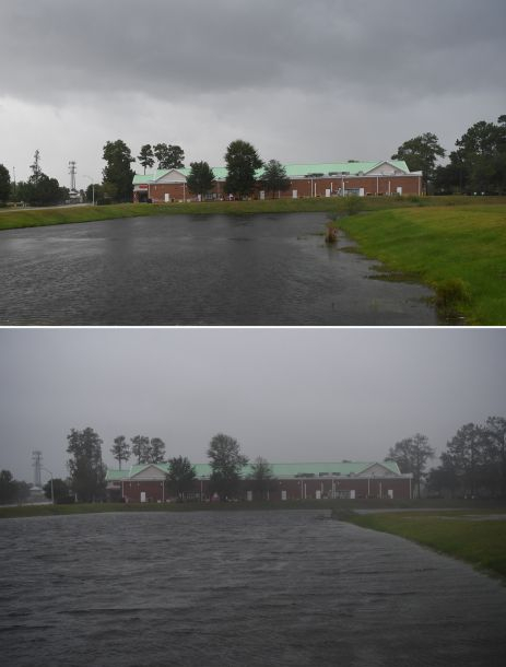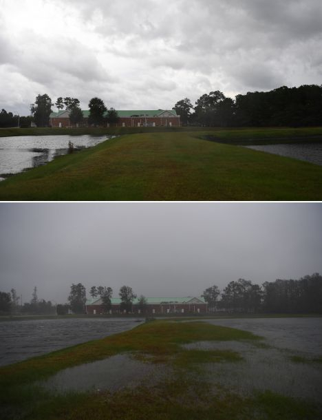 拼版照片:上图为9月13日在美国北卡罗来纳州威尔明顿市拍摄的小雨中的房屋;下图为9月14日在美国北卡罗来纳州威尔明顿市拍摄的暴风雨中的房屋。 新华社记者刘杰摄