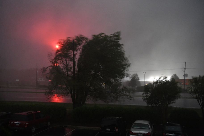 9月14日凌晨,在美国北卡罗来纳州威尔明顿市,一棵大树在暴风雨中摇摆。 新华社记者刘杰摄