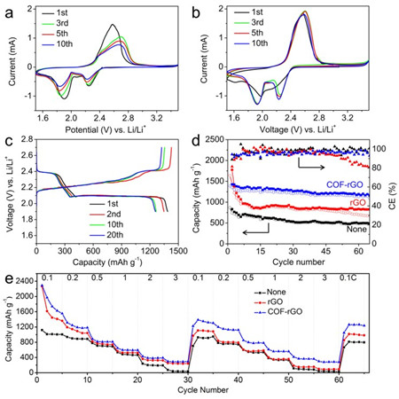 活性材料多硫化锂的穿梭效应是锂硫电池的一大关键问题,会造成锂硫电池性能的大幅衰减。获得的双层COF-rGO薄膜进而被用作离子筛,用于锂硫电池中。添加了该双层薄膜之后,多硫化锂的穿梭效应被有效抑制(图二),锂硫电池的性能得到了大幅改善(图三)。同时充放电之后,薄膜仍然能保持形貌和结构的稳定。