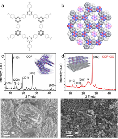 针对此问题,该课题组前期将有机电子学中获得pin-hole free介电层薄膜的概念引入到有机电池领域,利用聚合物获得了一种离子选择性渗透膜。该渗透膜有效地抑制了电极材料在正负极间的扩散。组装了该渗透膜后,电池的循环使用寿命大幅提高。该工作被发表在《先进材料》上(Adv. Mater. 2016, 28, 9182)。对于这样的渗透膜,具有有序、可控纳米孔的层状共价有机网格(COFs)似乎是一种更好的选择。但是通常COFs并不溶解,很难制备有序的、致密的薄膜,使纳米孔有序排列从而一方面保证离子的穿梭、但另一方面又能阻挡活性电极材料的通过。早期有工作提出共轭COFs的π–π作用可以使材料在高压下有序排列。基于此,王成亮教授等人认为石墨烯的π–π作用可能也可以用于诱导COFs的有序排列。为此,他们通过简单的过滤,直接将COFs的分散液抽滤到预先获得的石墨烯薄膜上,便实现了COFs的有序排列。形貌分析、粉末XRD和掠入射XRD结果都表明COFs的片状颗粒几乎全部采用“face-on”的模式平铺在石墨烯上(图一)。