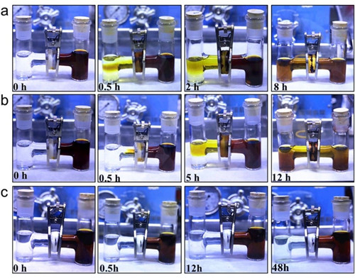 通用离子筛对于多硫化锂穿梭的抑制效应(从上到下分别为普通隔膜,添加了石墨烯和双层COF-rGO薄膜后的效果)