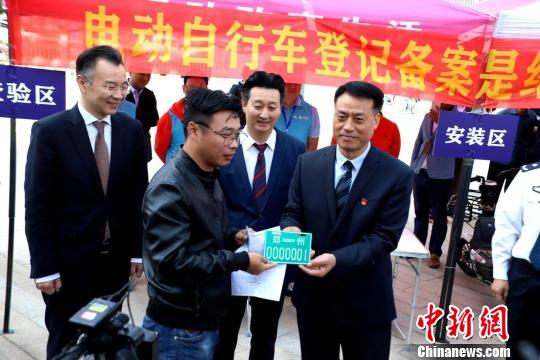 原标题:郑州首张电动自行车“绿”号牌发出 电动车上牌全面启动