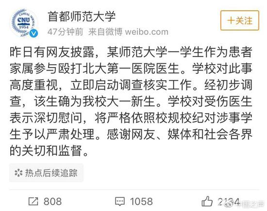 另有网友表示,殴打医生中的一女子疑首都师范大学学生。13号下午,首都师范大学官微回应称:经初步调查,该生确为我校大一新生。学校对受伤医生表示深切慰问,将严格依照校规校纪对涉事学生予以严肃处理。