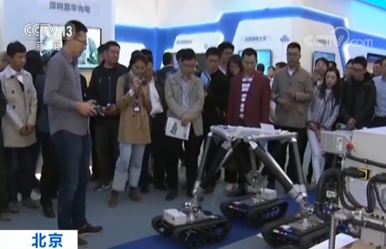 参展商 李贵涛:它驮一个比较精密的仪器,可以一边在崎岖的山路上行走,一边保证上面驮着的仪器不动、不晃。