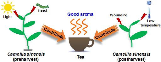 茶树(Camellia sinensis)是我国重要的经济作物,中国是最早发现与利用茶树的国家,至今已有数千年历史;茶也成为全世界第二大饮料,仅次于净水。与其他植物相比,茶树中次生代谢产物有其独特性,这些物质不仅赋予了茶叶独有的色、香、味品质,而且与人体健康密切相关。多酚、氨基酸和香气是茶叶品质的核心物质。茶叶中含有丰富的多酚类物质(18-36%)和氨基酸物质(1-4%),香气物质(0.005-0.03%)含量相对较低。研究茶叶香气物质的形成具有重要的科学意义,同时为改进茶叶品质提供重要技术支撑。茶叶香气的形成,根据反应类型的不同可分为三种类型,包括茶叶细胞相对活体状态下的酶促反应(存在于茶树生长过程和采后加工的部分阶段,包括基因表达激活与酶和底物反应)、茶叶细胞破碎状态下的酶促反应(存在于采后加工阶段,主要是酶和底物反应)和热物理化学反应(存在于采后加工和深加工阶段)。