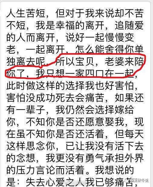 12点27分,有人发现戴春彦更新了朋友圈,这是一封绝笔信:“我是幸福的离开,追随爱的人离开。说好的一起慢慢变老,一起离开,怎么能舍得你单独离去呢,所以宝贝,老婆来陪你了,我只想一家四口在一起……我更没有勇气承担外界的压力言论而活着……我已经被逼的没有选择、没有退路……”
