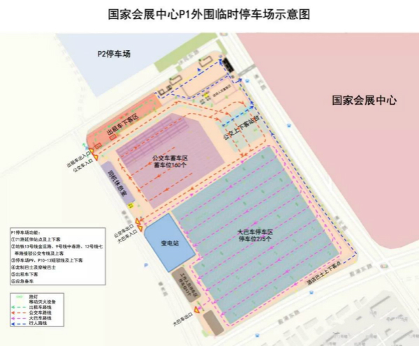 轨道交通方面,距离国家会展中心较近的车站是2号线徐泾东站、10号线虹桥火车站、17号线诸光路站。当2号线客流较大时,建议搭乘10号线至虹桥火车站后,换乘17号线至诸光路站抵达国家会展中心。散场客流高峰时,离场馆最近的2号线徐泾东站将限流,预计排队进站耗时在40分钟以上,建议观众可直接步行至国家会展中心西北面的17号线诸光路站,再换乘10号线前往中心城区。每天下午3时起,在国家会展中心西侧的P1停车场内,可搭乘3条接驳线分流散场,分别到达9号线中春路站、12号线七莘路站和13号线金运路站。