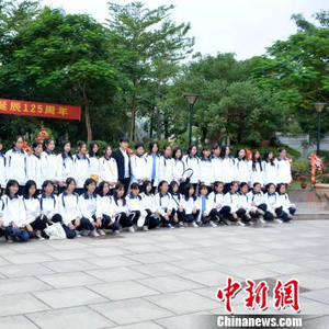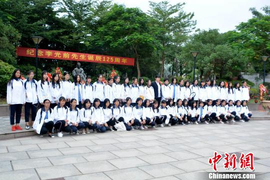 10月18日,“纪念李光前先生诞辰125周年系列活动”在李光前故乡福建省南安市梅山镇举行。图为当地学生在李光前铜像前合影。 孙虹 摄