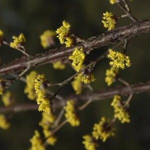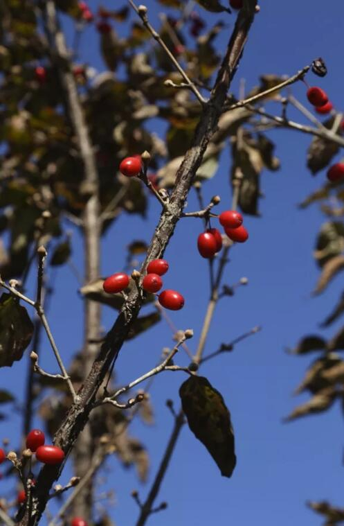 山茱萸花期极早,三月初与梅花同开,早春枝头点缀着些黄色小花,聚拢如伞形,十一月果子成熟,大小形状如枸杞。山茱萸果在枝头上是鲜红色,明亮有光泽,很是抢亮。虽也有茱萸之名,但不是古诗说的茱萸。