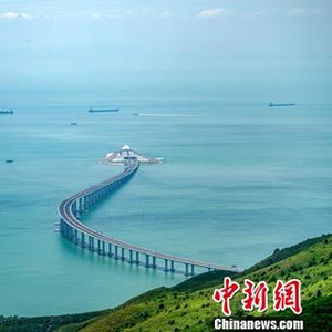 资料图:港珠澳大桥全线联合试运行通关测试9月28日至30日进行,测试车辆在桥上行驶、上下乘客、通关查验以及应急演练等程序,前两日的各项测试均大致顺利,显示大桥基本达到通车运行条件。图为从香港大屿山远眺港珠澳大桥雄姿,东西人工岛及内地与香港段桥梁似双龙出海,蔚为壮观。(资料图片)中新社记者 张炜 摄