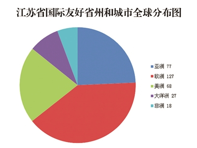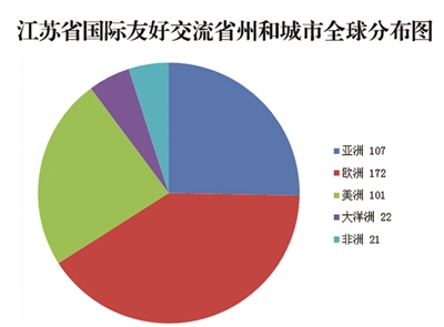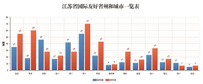 国际友城活动的蓬勃发展得益于改革开放,并推动了改革开放。自建立第一对友城以来,江苏积极开展对外交往,拓展与世界各国的交流范围。历时40年,江苏的国际“朋友圈”取得丰硕成绩,国际友城数量连续多年居全国第一。据省外办统计,截至今年8月,江苏已与世界60个国家缔结317对友好省州和城市,423对友好交流省州和城市,实现对全球主要经济体、新兴经济体和区域性大国全覆盖,遍布全球。其中,省级35对友好省州总面积达394万平方公里,总人口2.95亿,经济总量超8万亿美元。近年来,我省积极参与“一带一路”建设,发挥地处“一带一路”交汇点的独特优势,重点开展与“一带一路”沿线国家的地方交流,建立友好交流关系。江苏与沿线国家缔结98对友好省州和城市,153对友好交流省州和城市。