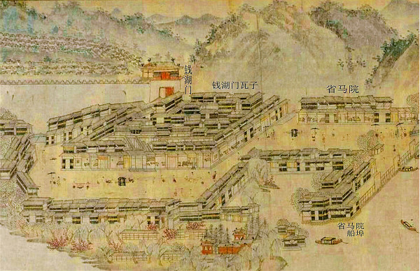 南宋《西湖清趣图》上的钱湖门瓦子。图中文字为研究《西湖清趣图》的学者陈珲所标注。