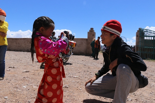 2017年,长江第一峡谷科考队队员与来自措池村的小女孩交谈