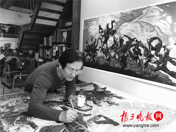 过完十一,我刚刚完成了中国国家文化和旅游部、中国国家画院“一带一路”国际美术工程的特邀创作巨幅绝版套色版画《魂之跃》,这幅版画是1.2米x2.4米,用整版绝版技法完成这样大幅的版画对作者功力和体力都是巨大挑战。此作前后耗时三年,经过国家级专家会10次评审顺利通过。我这幅作品表现的是陕北的安塞腰鼓,场面宏大,气势壮观,人物众多,特别是人物瞬间产生的情绪表达和动态形体表现难度很大,在这三年中,我先是完成了一幅80x150cm的较小之作,此作获得草图终审,与中国国家画院正式签约并获得首次创作资金后,在再次原稿放大,放大其实就是重新调整,修正原稿不足的再次创作。又经过七个月的艰苦的创作和制作最终完成。这幅作品即是为完成国家任务而作,无疑也是我创作生涯中的最重要的代表作。