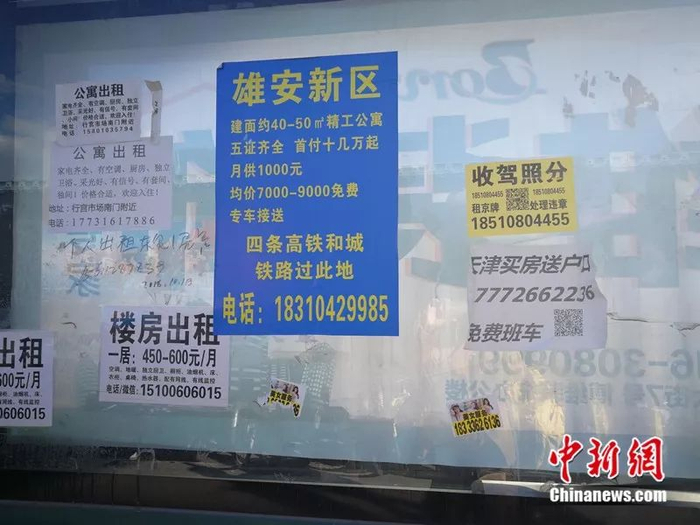 街道公交站牌旁边的综合宣传栏里贴着雄安新区的广告,“五证齐全,首付十几万起,均价7000-9000,免费专车接送”。