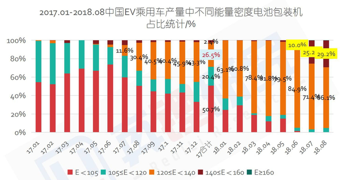 2017-2018.8 中国电动汽车乘用车产量中不同能量密度电池包的装机占比 来源:真锂研究