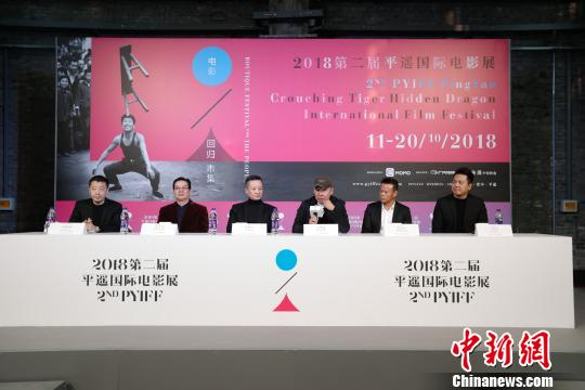 2018第二届平遥国际电影展从山西出发单元《古城片警》新闻发布会(由左至右:影展创始人贾樟柯、出品人成中和、演员阎维文、导演肖莫庸、演员黄品沅、制片人耿镭)。组委会提供
