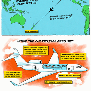 他打算飞往内华达州的一个着陆跑道。那里的一个机库里停放着一架喷气飞机,这架飞机的唯一目的是把他和4位与他共同拥有飞机的亿万富翁送到安全的地方。他们的目的地是新西兰——毛利人称之为“长白云之乡”。
