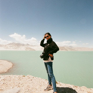 这次旅途,李博和丈夫还带了胶片相机用于记录旅途。和用手机和数码相机拍摄有所不同,胶片相机所拍摄的照片冲洗出来后,带着一种自然的老电影般的质感,色彩也更接近于肉眼所见,很真实。在用胶片相机拍摄的独库公路的照片中,远处的雪山和近处的湖泊,以及草地上的骆驼构成一幅自然且具有艺术感的画卷。