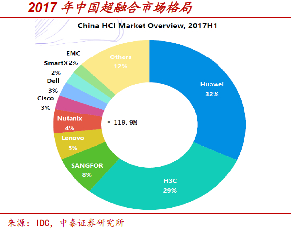 超融合是一种私有云形态,契合了部分中小客户的便捷性、安全需求正在快速增长。2017年国内超融合市场规模实现3.27亿美元,约占全球市场的9%,同比增长64%。中泰证券预计云计算成熟市场中,公有云渗透率将达35%以上,私有云约25%~30%,仍是一个非常大的市场。