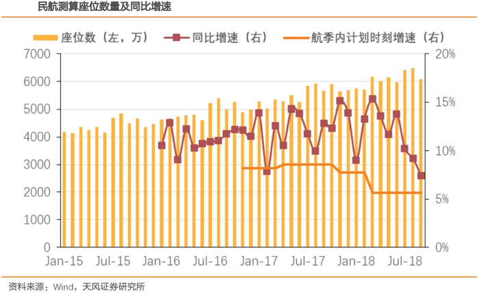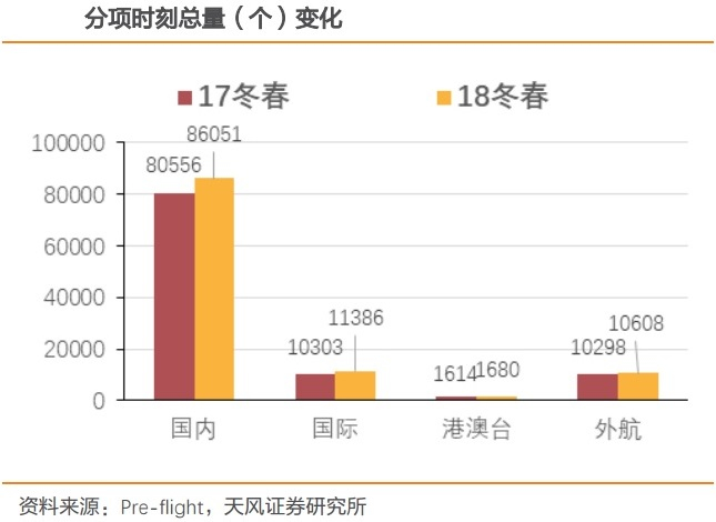 2018年夏秋季时刻总量增速同比仅为5.7%,而换季前民航局已明确时刻释放思路,即严控一线机场时刻容量,对部分准点率表现较好机场给予一定时刻奖励,时刻增量控制力度稍有边际放松,且冬春季航班相比夏秋季安排并不算密集,同时天气更有利于航班安全飞行,因此天风证券认为,换季后6.8%的时刻同比增速相比过去仍较紧张。