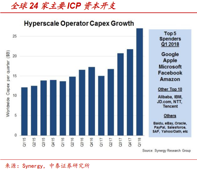 互联网和云计算的寡头效应催生了大型和超大型数据中心需求,很多大中型企业也开始将分布在各地的小型数据中心整合成大型数据中心。工信部数据显示,我国在用数据中心中小型为主,机架数量占61%,在建数据中心以大型和超大型为主,机架数量将占规划装机规模的85%。Synergy数据显示,2018年一季度全球24家主要的ICP资本支出达270亿美元,环比增长20%,同比增长80%,创历史单季最高水平。目前全球超大型数据中心数量已经增长到400个,目前全球至少有69个处于规划或建设阶段的超大规模数据中心,