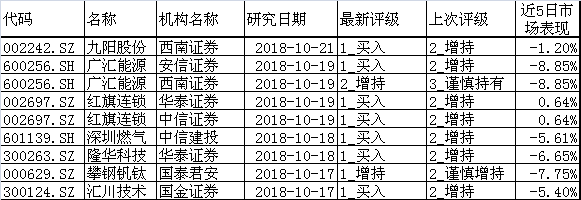 有7家公司获得9家机构调高评级,其中,广汇能源(600256.SH)、红旗连锁(002697.SZ)分别获得2家机构关注。