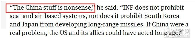 美国蒙特雷国际研究院东亚不扩散项目主任刘易斯(Jeffrey Lewis)在接受《卫报》21日采访时称:“所谓‘中国因素’就是胡扯。《中导条约》没有禁止海基和空基导弹武器系统,也没有禁止韩国、日本研发导弹。如果中国真是一个问题,美国及其盟国可能早就采取行动了。”