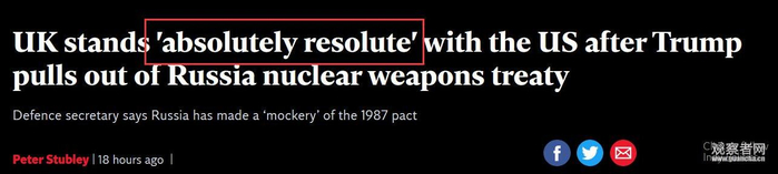 同时,英国则“绝对坚持”美国的决定。据《独立报》消息,英国国防部长威廉姆森(Gavin Williamson)21日表示,“我们亲密长期的盟友当然是美国,我们将绝对坚决支持美国通过此举来强调俄罗斯需要尊重它曾签订的条约义务。”