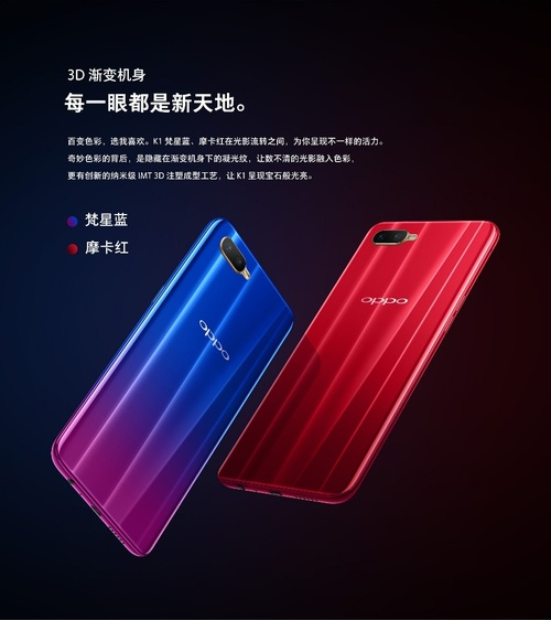 同时,K1机身采用纳米级IMT工艺实现3D渐变设计,高分子耐磨材料,具有更出色的韧性,颜色搭配采用梵星蓝、摩卡红两种配色,使OPPO K1充分呈现出高品质的华丽机身。此外,K1对《王者荣耀》、《穿越火线》等多款游戏进行了特定优化、智能场景识别、改善游戏卡顿、多核优化、充分调用处理器性能,给用户带来酣畅淋漓的游戏操控体验。