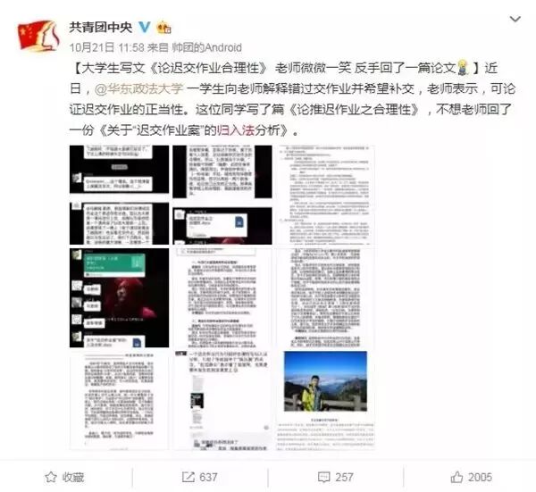 近日,华东政法大学一名学生因为没有按时上交作业,向老师解释错过交作业的原因并希望补交。老师则表示,可以论证迟交作业的正当性。为此,这位同学写了篇《论推迟作业之合理性 》,不想老师回了一份《关于“迟交作业案”的归入法分析 》,引起网友热议。