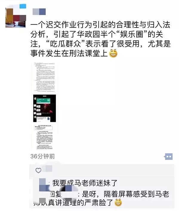 写到此处时,鄙人发现朋友圈上已有同学对此事进行了转发,以朋友圈的信息传递速度,可以预见 “ 迟交作业的正当性 ” 之争已经有了一定的关注度。恳请老师能在这么多期待着裁决结果的热切的目光的注视下,网开一面,向广大同学一展华政老师虽遵循着铁面法律也还有人性的温度的风采。